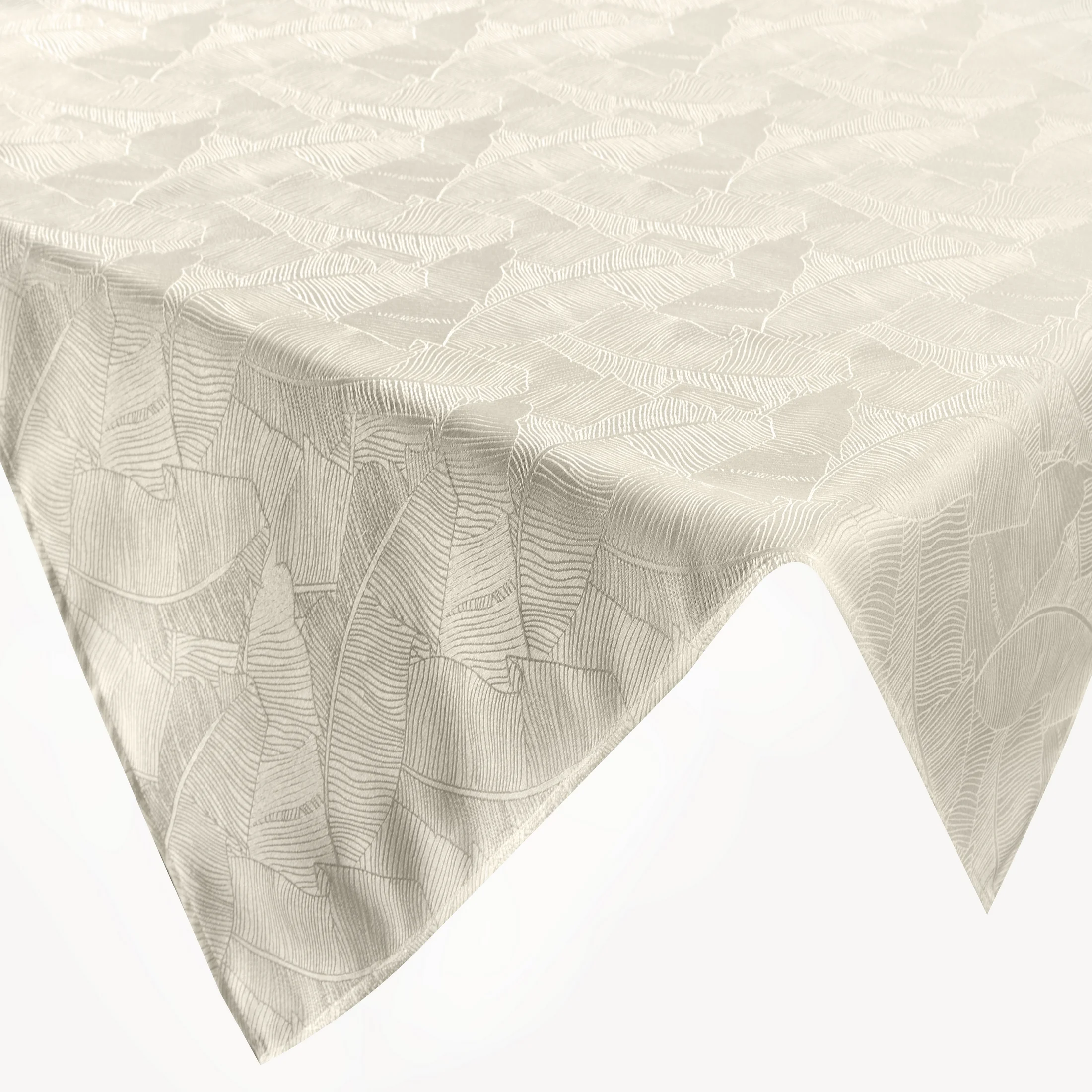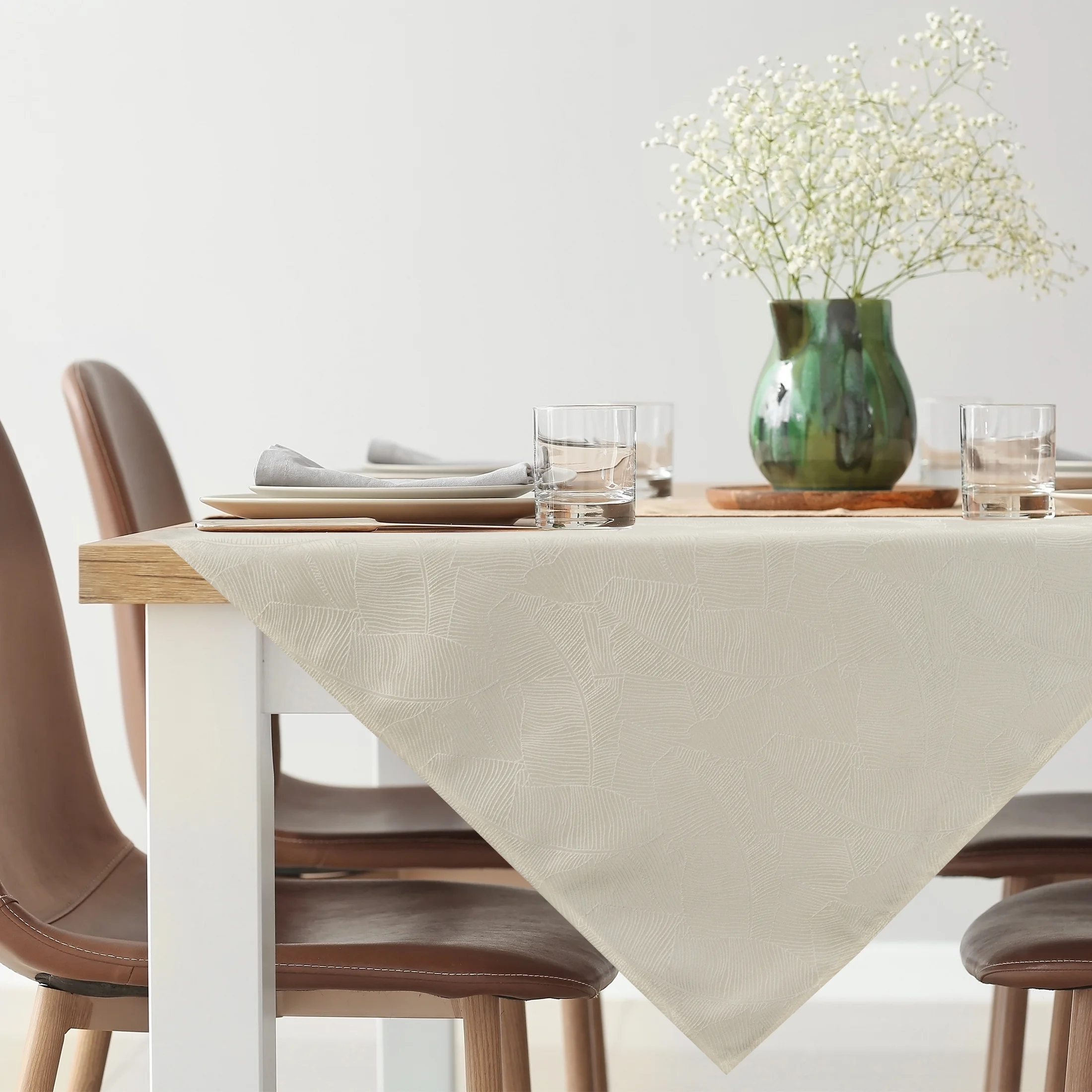 Efektowna dekoracja stołu podkreśla wyjątkowość chwil spędzanych przy wspólnym posiłku. Klasyczny, jasny obrus zdobiony delikatnym, żakardowym wzorem z modnym motywem liści doskonale wkomponuje się w aranżację jadalni i stworzy dyskretne tło dla wytwornej zastawy i pięknie podanych potraw. Połyskująca tkanina jest odporna na plamy i łatwa w praniu, dzięki czemu nie musisz przejmować się drobnymi wpadkami przy stole.