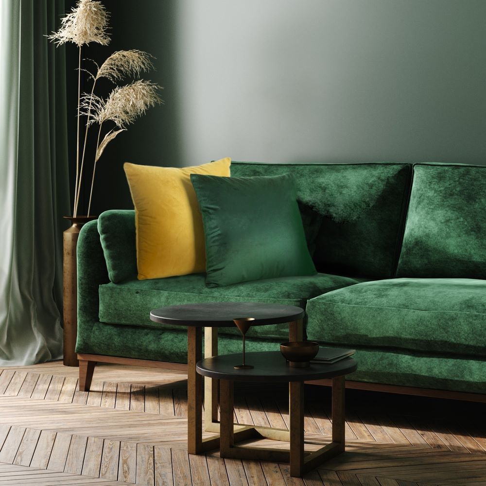 Trend dla odważnych, którzy nie boją się eksperymentów z kolorem to butelkowa zieleń, głęboki granat, burgund czy energetyczna terakota, które nadadzą wnętrzom wyrazistości. W modnych salonach 2025 pojawią się również czarne detale. W postaci lamp, uchwytów mebli, ram luster czy metalowych elementów stolików kawowych.