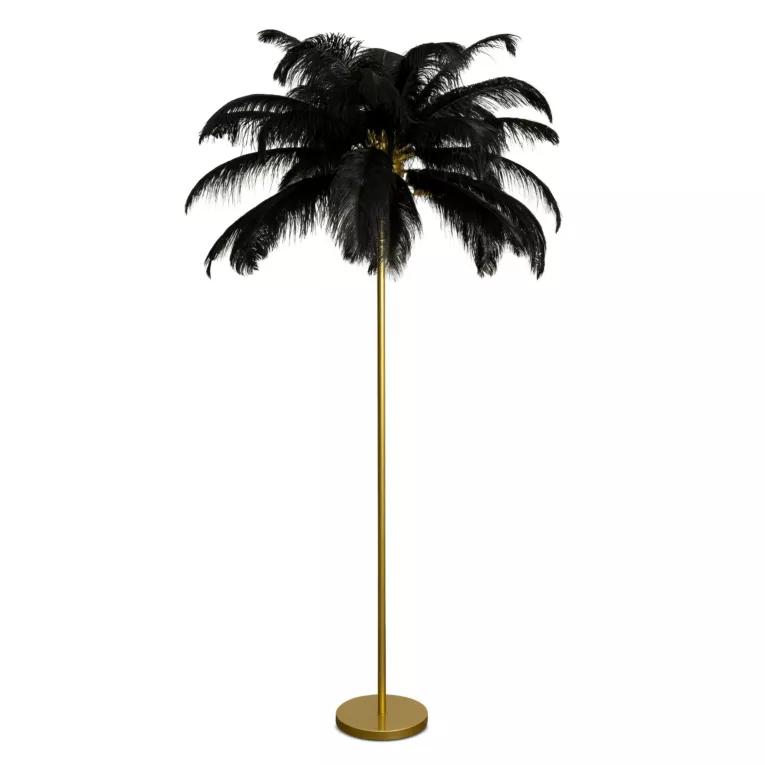 Lampa stojąca do salonu czarno, złota FERI na metalowej podstawie z efektownym abażurem z naturalnych strusich piór Eurofirany
