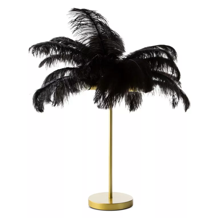 Lampa stołowa do salonu czarno, złota FERI na metalowej podstawie z niezwykle efektownym abażurem z naturalnych strusich piór Eurofirany