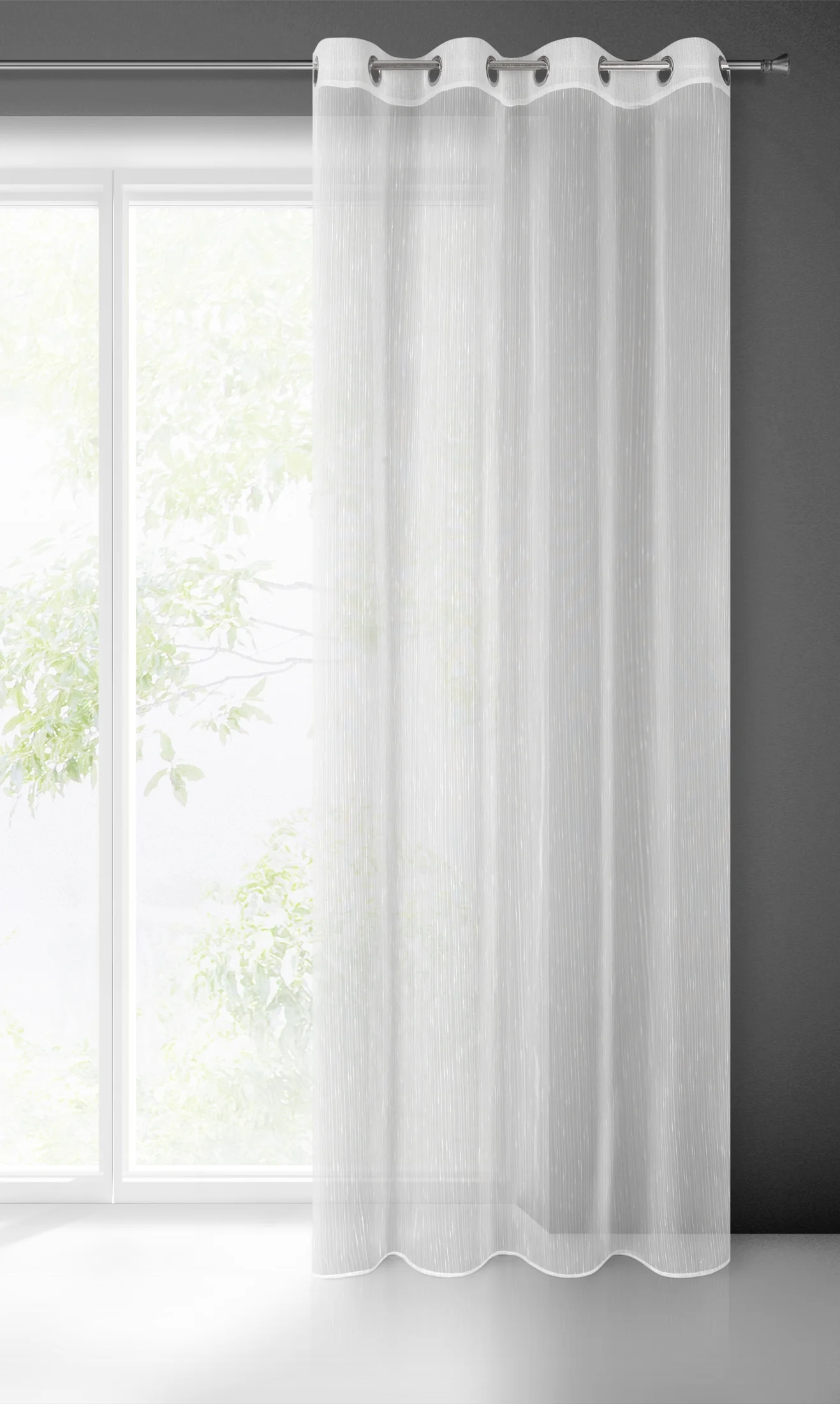 Klasyczna, gładka firana z lekkiej etaminy wyróżnia struktura subtelnego deszczyku, który podkreśla półprzejrzystą tkaninę. Uniwersalny charakter sprawia, że firana doskonale prezentuje się w każdym wnętrzu. Lekka tkanina delikatnie rozprasza światło wpadające z zewnątrz. Zastosowana taśma marszcząca pozwala dopasować szerokość firany do indywidualnych potrzeb i upiąć ja za pomocą żabek, agrafek lub haczyków. Pod taśmą skrywa się tunel, który daje możliwość upiecia firany również na karniszu drążkowym.