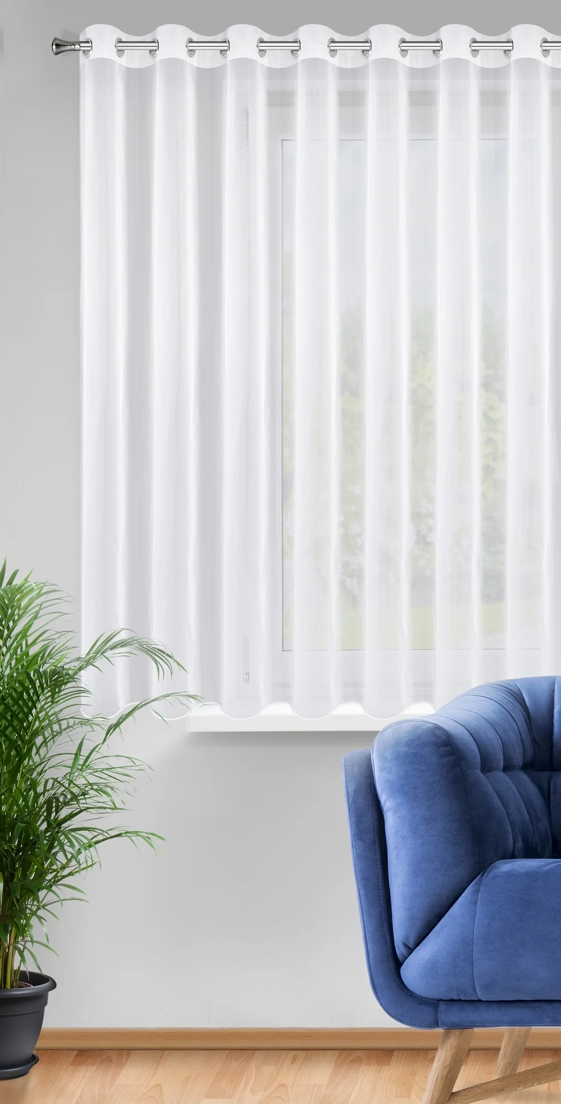 Klasyczna firana o prostym kroju i białym kolorze to doskonały wybór do salonu lub sypialni. Jednokolorowa tkanina o subtelnym splocie pozostaje całkowicie gładka jedynie subtelna lśniąca moherowa nitka urozmaica jej powierzchnię dyskretnym blaskiem. Delikatny materiał decyduje o uroku firany. Warto połączyć tę klasyczną firanę z kolorowymi zasłonami. Tak przyozdobione okna nie wymagają już żadnych dodatkowych barw. Zastosowany system szerokich przelotek pozwala na szybkie i wygodne upięcie firany na karniszu drążkowym.