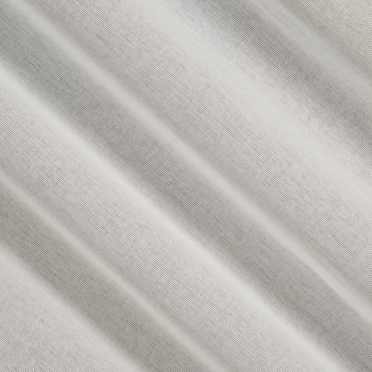 Firana szyta na przelotkach srebrna z półmatowej etaminy o luźnym splocie, wykończona obciążnikiem