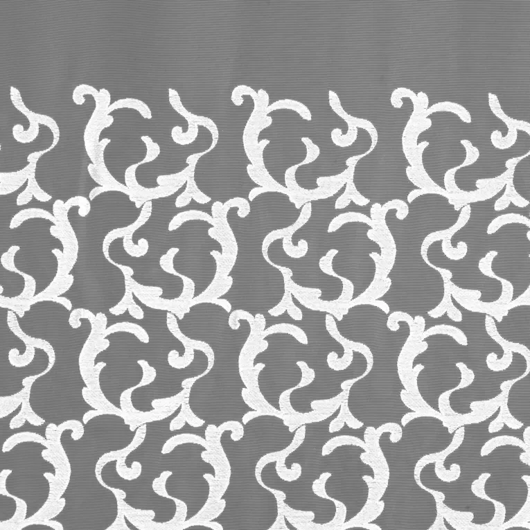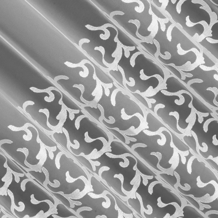 Gładka, matowa mikrosiateczka w kolorze białym wykończona w dolnej części szerokim pasem ornamentowego haftu. Znakomicie prezentuje się, zarówno solo, jak i w towarzystwie dobranych zasłon. Ta firana to stylowy dodatek wpływający na wizualne ocieplenie wnętrza i zjawiskowo zdobiąca okno. Tkanina o przezroczystej strukturze, zapewnia wnętrzu wiele naturalnego światła, dlatego będzie odpowiednia szczególnie do mało nasłonecznionych pomieszczeń, które chcemy doświetlić słonecznym światłem. Pięknie zaprezentuje się w we wnętrzu klasycznym, we wnętrzu w stylu retro czy typowo romantycznej stylizacji. Firana wykończona jest dołem w formie delikatnej fali.