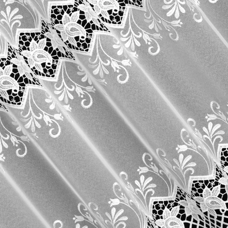 Delikatna i lekka tkanina typu markizeta w odcieniu śnieżnej bieli zdobiona w dolnej części dwoma pasami haftu z gipiury. Elegancka i delikatna pięknie się układa i znakomicie prezentuje w świetle okna. Firana idealnie pasuje do wnętrz zaaranżowanych i urządzonych w klasycznym stylu, znakomicie zaprezentuje się również w stylu glamour w towarzystwie dobranych, np. zasłon z miękkiego welwetu. Struktura materiału subtelnie przysłania okno, przepuszczając jednak wystarczającą ilość naturalnego światła, dlatego polecamy ją szczególnie do pomieszczeń mocno nasłonecznionych, w których chcemy ograniczyć bezpośrednie nasłonecznienie. Klasyczny ażurowy haft znakomicie podkreśla elegancję wnętrza. Serdecznie polecamy.