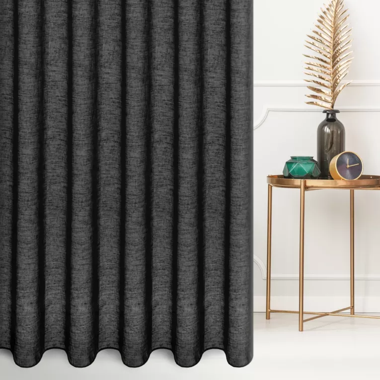Firana szyta na taśmie fala czarna z gładkiej matowej etaminy o naturalnym splocie, wykończona obciążnikiem