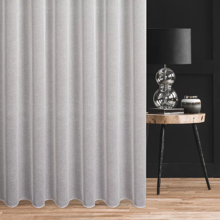 Nowoczesna i elegancka tkanina firanowa wykonana z drobnej siateczki o dekoracyjnym, geometrycznym splocie, która nadaje wnętrzu wyjątkowego charakteru. Subtelne, regularne wzory tworzą ciekawą strukturę materiału, przyciągając wzrok, a jednocześnie zachowując lekkość i przewiewność.