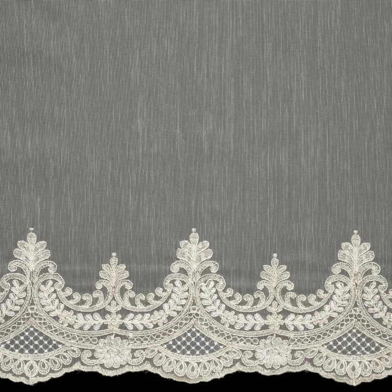 Zwiewna i delikatna tkanina aden zdobiona na dole delikatnym haftem ornamentu wykonany nicią kordonkową. . Subtelna matowa tkanina pięknie się układa i znakomicie prezentuje, zarówno w towarzystwie zasłon, jak i samodzielnie. Lekka, transparentna tkanina nie ogranicza naturalnego światła, dlatego warto ją zastosować w słabo nasłonecznionych pomieszczeniach, które wymagają doświetlenia naturalnym światłem. Modny i ponadczasowy wzór będzie wdzięcznie się prezentować we wnętrzach urządzonych w stylu romantycznym, klasycznym czy retro. Do tej tkaniny polecamy tkaniny zasłonowe z romantycznymi motywami, tkaniny gładkie, nabłyszczane oraz zasłony z miękkiego welwetu.