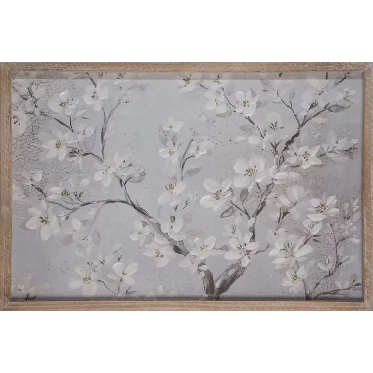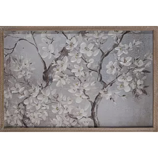 Ręcznie malowany na płótnie obraz przedstawia kwitnącą wiosenną gałązkę.  Dekoracja utrzymana jest w  stonowanej szarobeżowej kolorystyce,  którą rozświetlają srebrne akcenty brokatu. Taki detal idealnie sprawdzi się w klasycznym wnętrzu, a także znakomicie harmonizuje z nowoczesnymi trendami. Obraz został oprawiony w drewnianą ramę, która, dodaje mu elegancji. Polecamy również inne obrazy z naszej oferty.