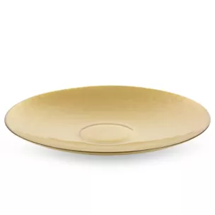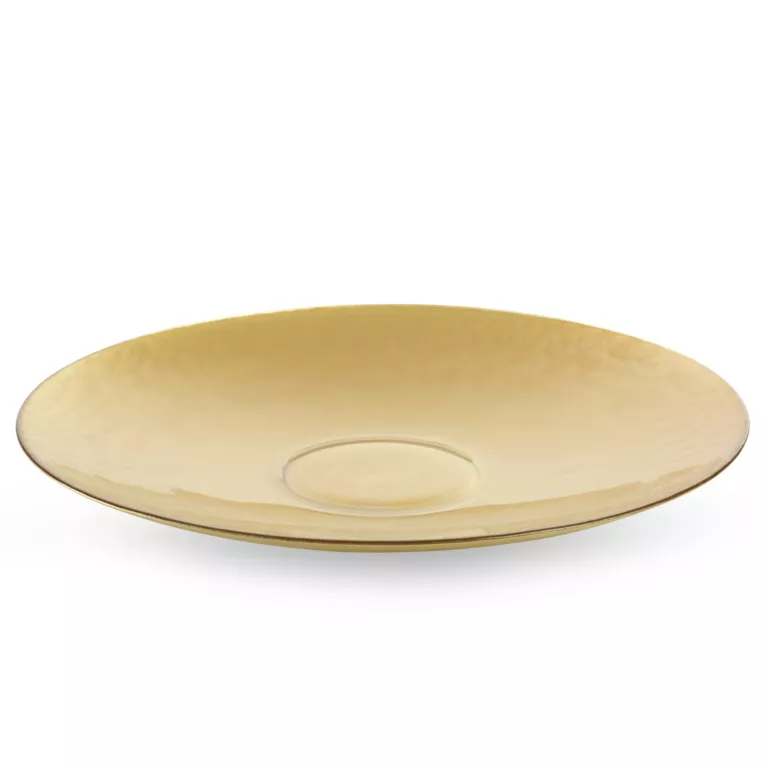 Okrągła, płaska patera ze szkła artystycznego w złotej tonacji, to nie tylko elegancki, ale również praktyczny dodatek w domowej przestrzeni. Złota barwa, sprawia,  że patera wyróżni się w każdym wnętrzu. Można ją zestawić razem pozostałymi elementami kolekcji, wspólnie tworzącymi spójną kompozycję. Taki detal świetnie sprawdzi się we wnętrzach urządzanych w stylu glamour.