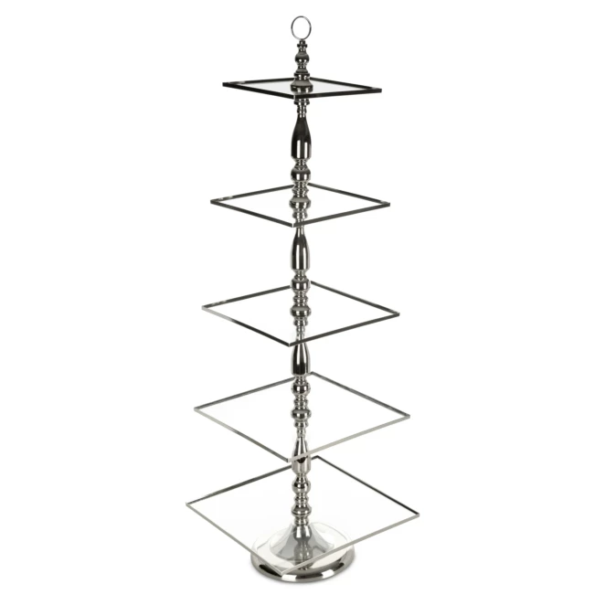 Nowoczesna i minimalistyczna patera o imponującym designie, która zachwyca swoją funkcjonalnością i elegancją. Metalowa podstawa w stonowanym wykończeniu tworzy solidną i trwałą konstrukcję, nadając całej kompozycji prostotę i nowoczesny charakter. Patera składa się z czterech przestronnych pięter wykonanych z przejrzystego szkła, które dodają jej lekkości i zapewniają mnóstwo miejsca na prezentację różnorodnych smakołyków. Każde piętro jest starannie wykonane, co gwarantuje stabilność i bezpieczeństwo użytkowania. Idealna do eksponowania ciasteczek, owoców podczas uroczystości, a jednocześnie stanowi wyjątkowy element dekoracyjny, który wpisuje się w styl nowoczesny, skandynawski czy industrialny.