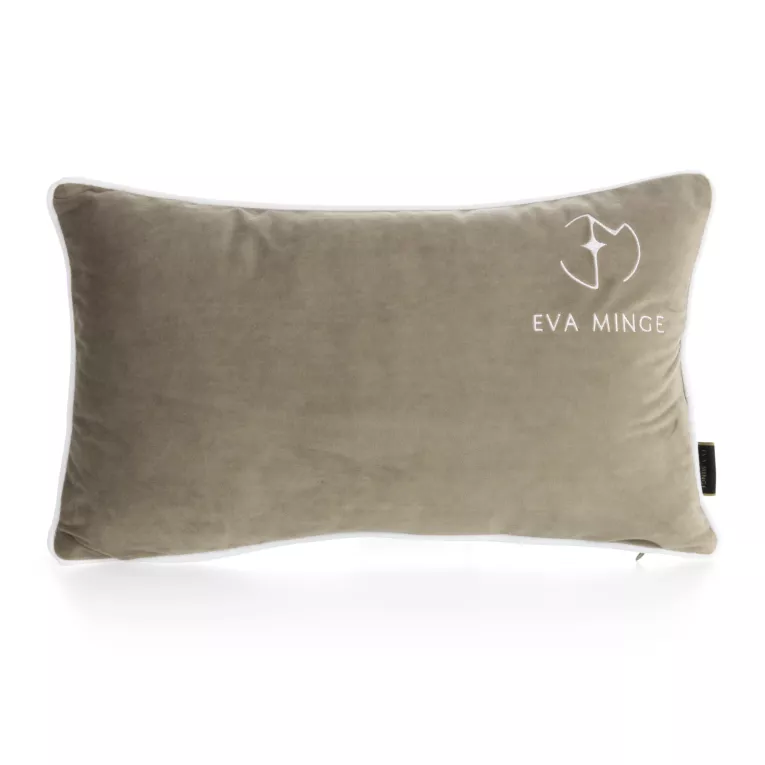Poszewka na poduszkę 30x50 cm welwetowa zdobiona haftowanym logo MINGE beżowa Eva Minge Eurofirany