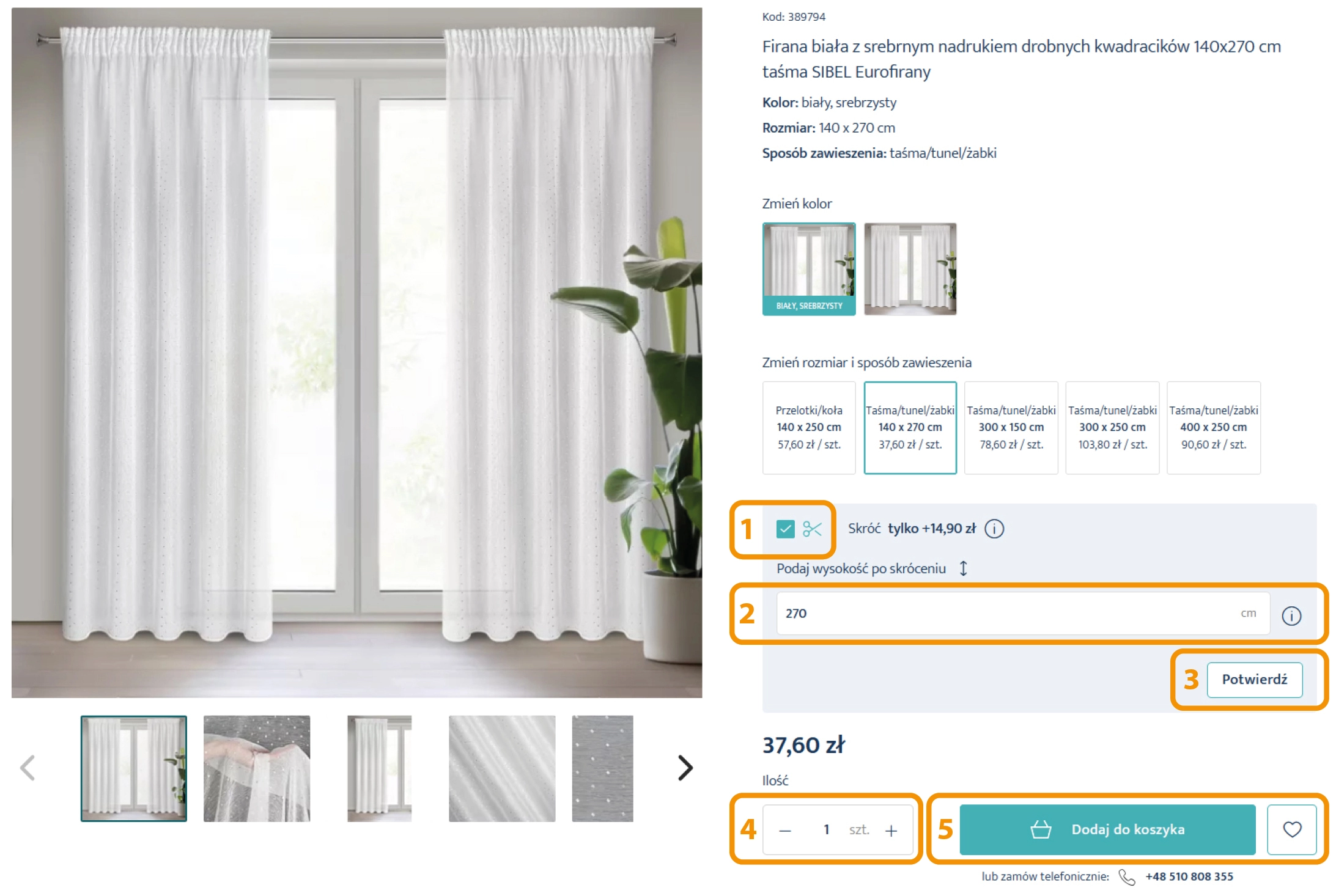 2. W oknie "Podaj wymiar po skróceniu" wpisz pożądaną wysokość firany lub zasłony (z dokładnością do 1 cm).