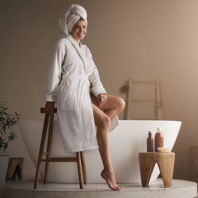 Elegancki szlafrok bawełniany, który łączy wygodę z wyrafinowanym stylem. Wykonany z wysokiej jakości bawełny, jest miękki, przewiewny i przyjemny w dotyku, co sprawia, że doskonale sprawdza się zarówno w chłodniejsze poranki, jak i w relaksujące wieczory. Szlafrok ma klasyczny krój z wygodnym kołnierzem i dwoma praktycznymi, głębokimi kieszeniami, które dodają mu funkcjonalności. Na rękawie szlafroka znajduje się subtelnie wyhaftowane logo kolekcji Ewa Minge, które podkreśla jego luksusowy charakter. Delikatny haft dodaje szlafrokowi elegancji, a jednocześnie pozostaje dyskretnym, stylowym akcentem, świadczącym o wyjątkowej jakości. Dzięki wiązaniu w pasie, szlafrok idealnie dopasowuje się do sylwetki, zapewniając komfort noszenia i podkreślając talię. To idealny wybór dla osób ceniących połączenie komfortu, praktyczności i eleganckiego designu, z odrobiną luksusu sygnowanego renomowanym nazwiskiem. Doskonały do codziennego użytku, jak i jako stylowy prezent.