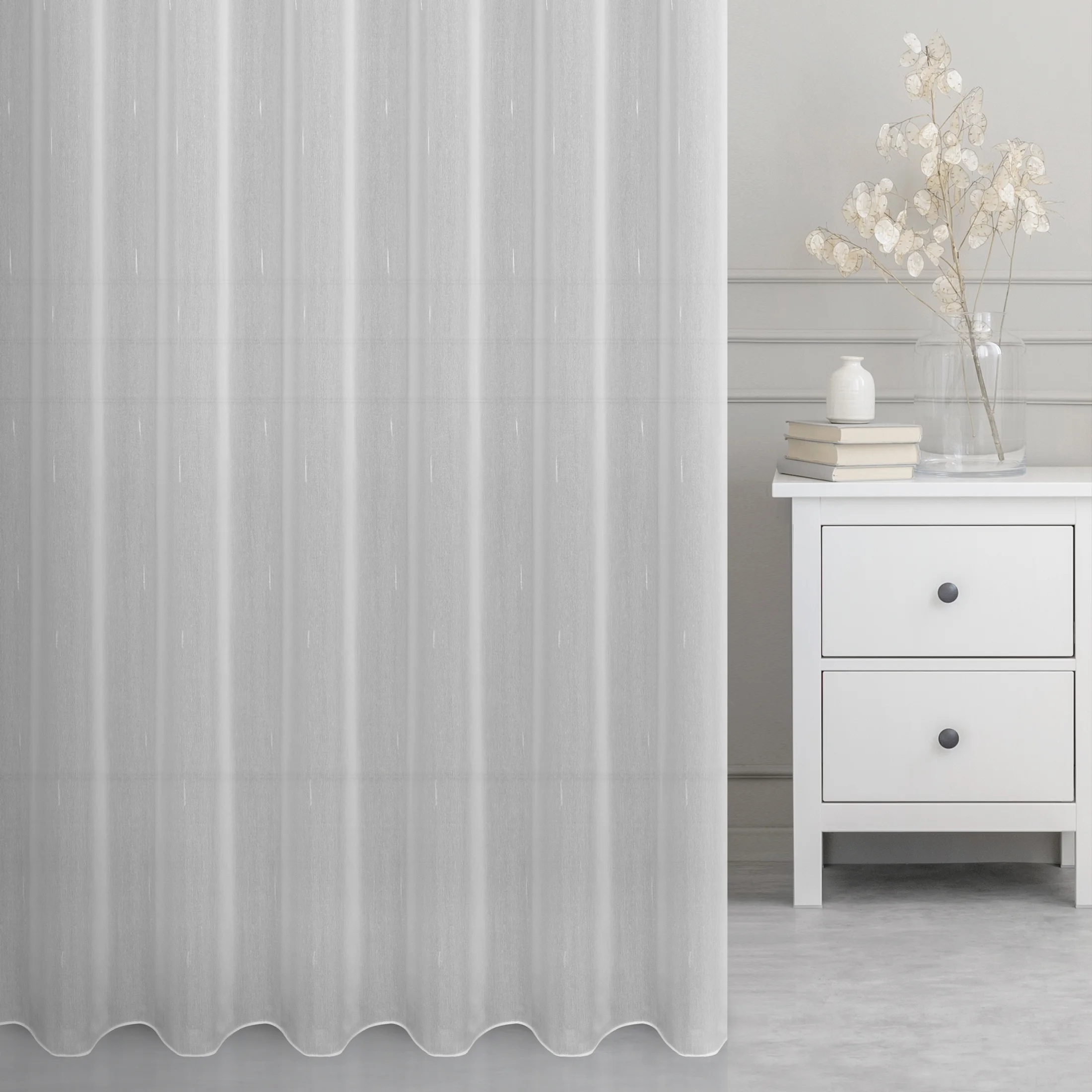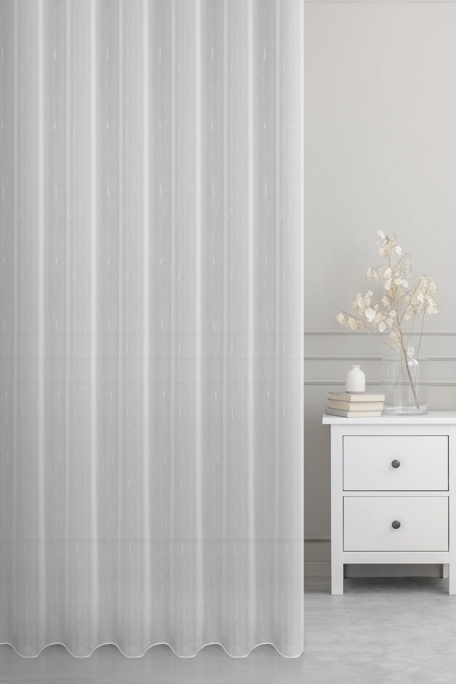 Gładka i delikatna tkanina z subtelnym efektem deszczyku, pięknie się układa i znakomicie prezentuje. Matowa, transparentna tkanina nie ogranicza dopływu naturalnego światła, dlatego warto ją zastosować w słabo nasłonecznionych pomieszczeniach, gdyż dobrze doświetla wnętrze naturalnym światłem. Firana  będzie się dobrze prezentować we wnętrzach urządzonych w stylu romantycznym, klasycznym czy retro. Do tej tkaniny polecamy tkaniny zasłonowe z romantycznymi motywami, tkaniny gładkie, nabłyszczane oraz zasłony z miękkiego welwetu. Szew obciążający umieszczony w dolnej krawędzi firany sprawia, że firana nienagannie prezentuje się na po zawieszeniu na karniszu.