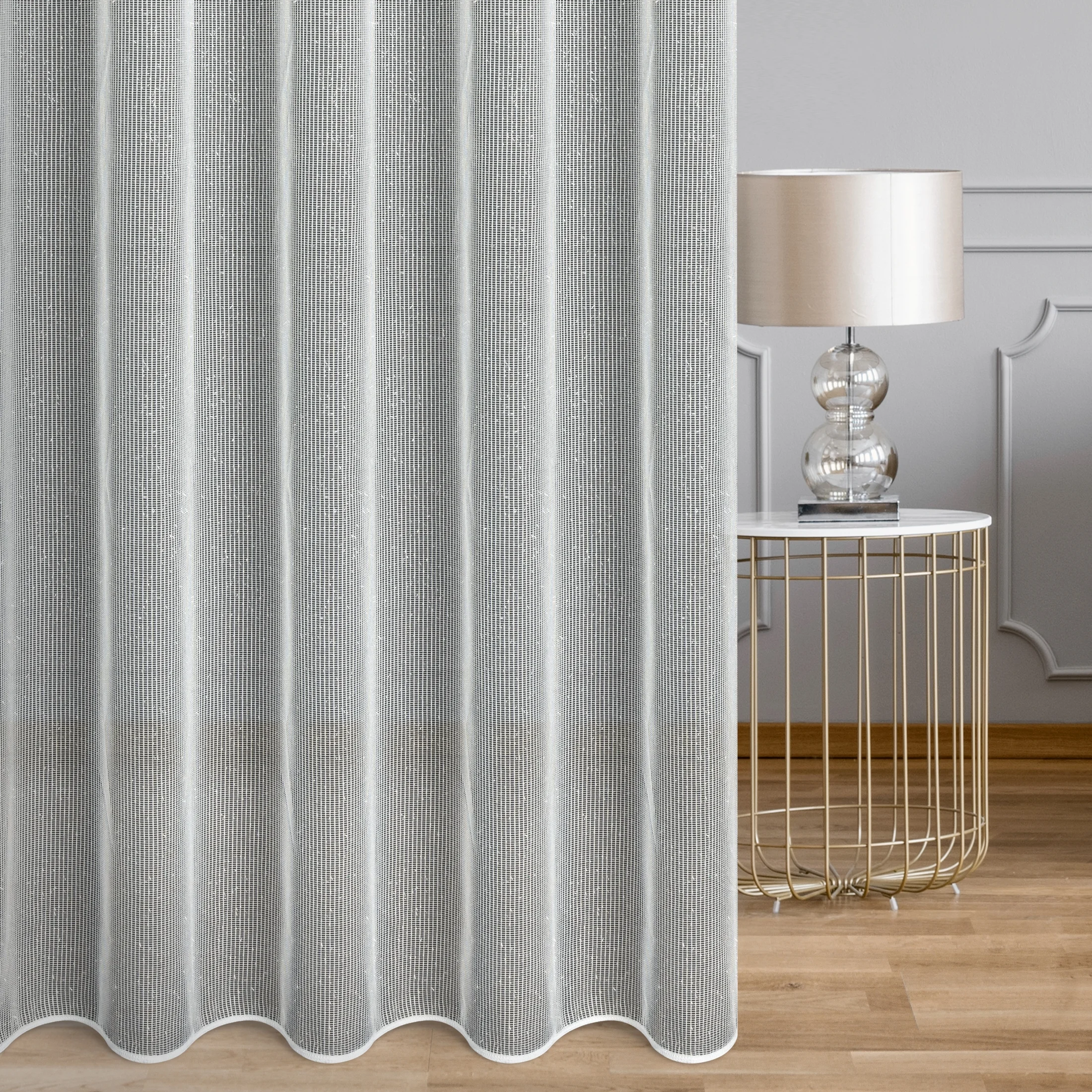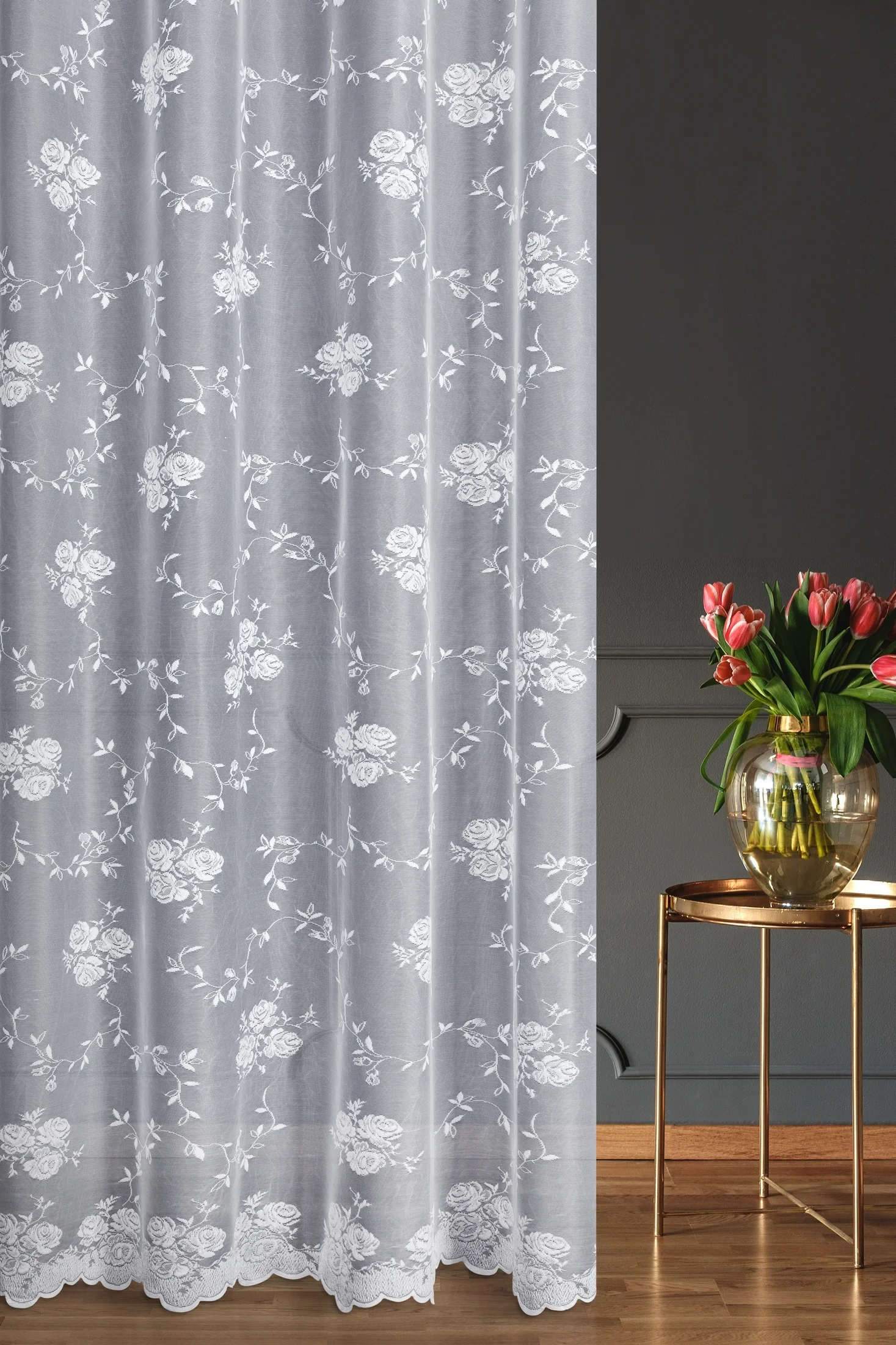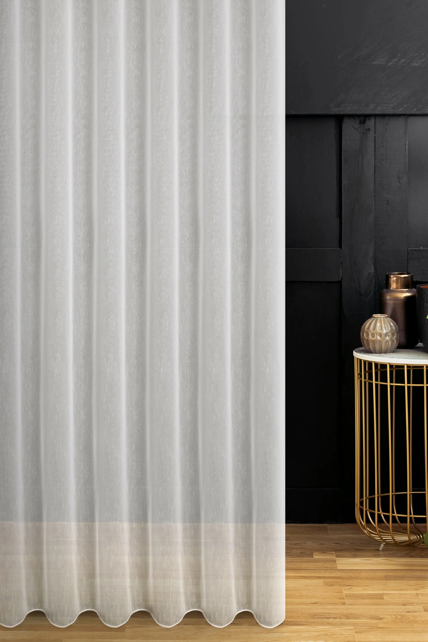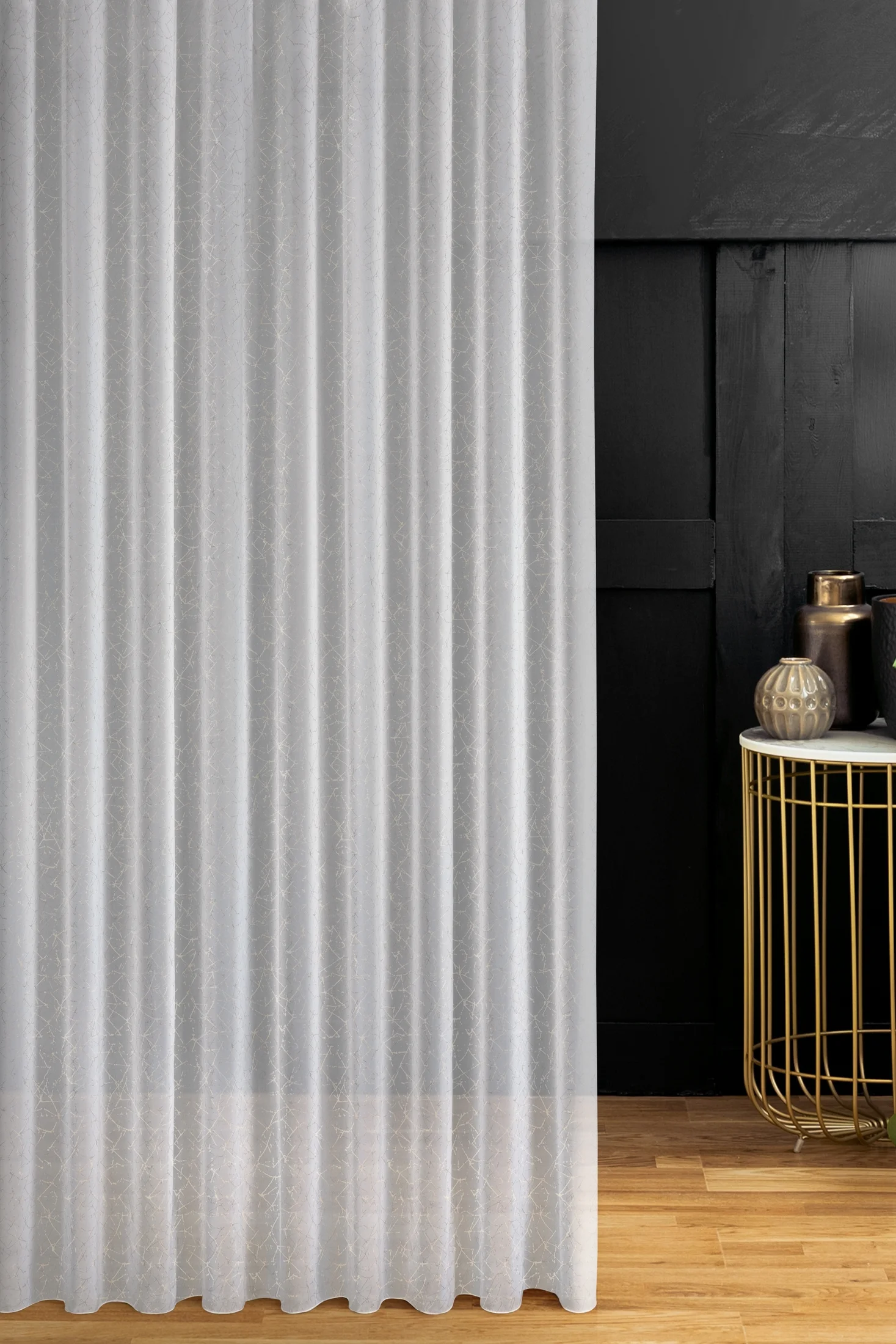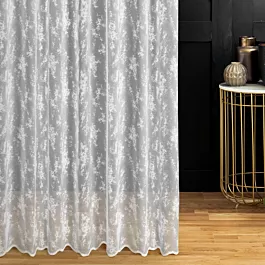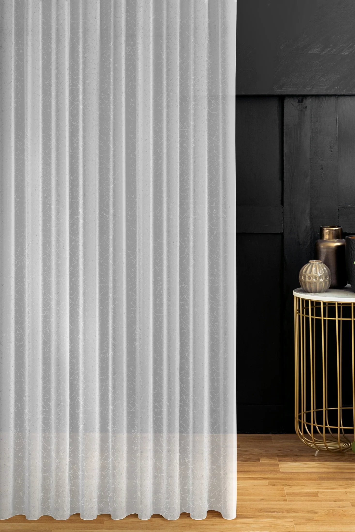 Żakardowa tkanina o gęstym splocie zdobiona nieregularnym wzorem z efektem przecierki to dekoracja pasująca do wnętrza w stylu klasycznym, nowoczesnym, oraz glamour. Półtransparentna tkanina  w kolorze białym, znakomicie odświeża i doświetla wnętrze. Firana ładnie się układa i dobrze prezentuje, zarówno w towarzystwie dobranych, gładkich zasłon, jak i samodzielnie.  Wzór przecierki przyciąga wzrok i dodaje dekoracji nastrojowego wdzięku. Taki elegancki dodatek wpływa na wizualne ocieplenie wnętrza i zapewnia naszym oknom znakomitą prezencję. Tkanina osłania okno, nie powodują zaciemnienia wnętrza, dzięki czemu pomieszczenie jest oświetlone naturalnym światłem. Polecamy  do wnętrz mocno nasłonecznionych, które chcemy osłonić przed nadmiarem promieni słonecznych. Dzięki właściwościom i strukturze firana nie wymaga mozolnego pracowania.