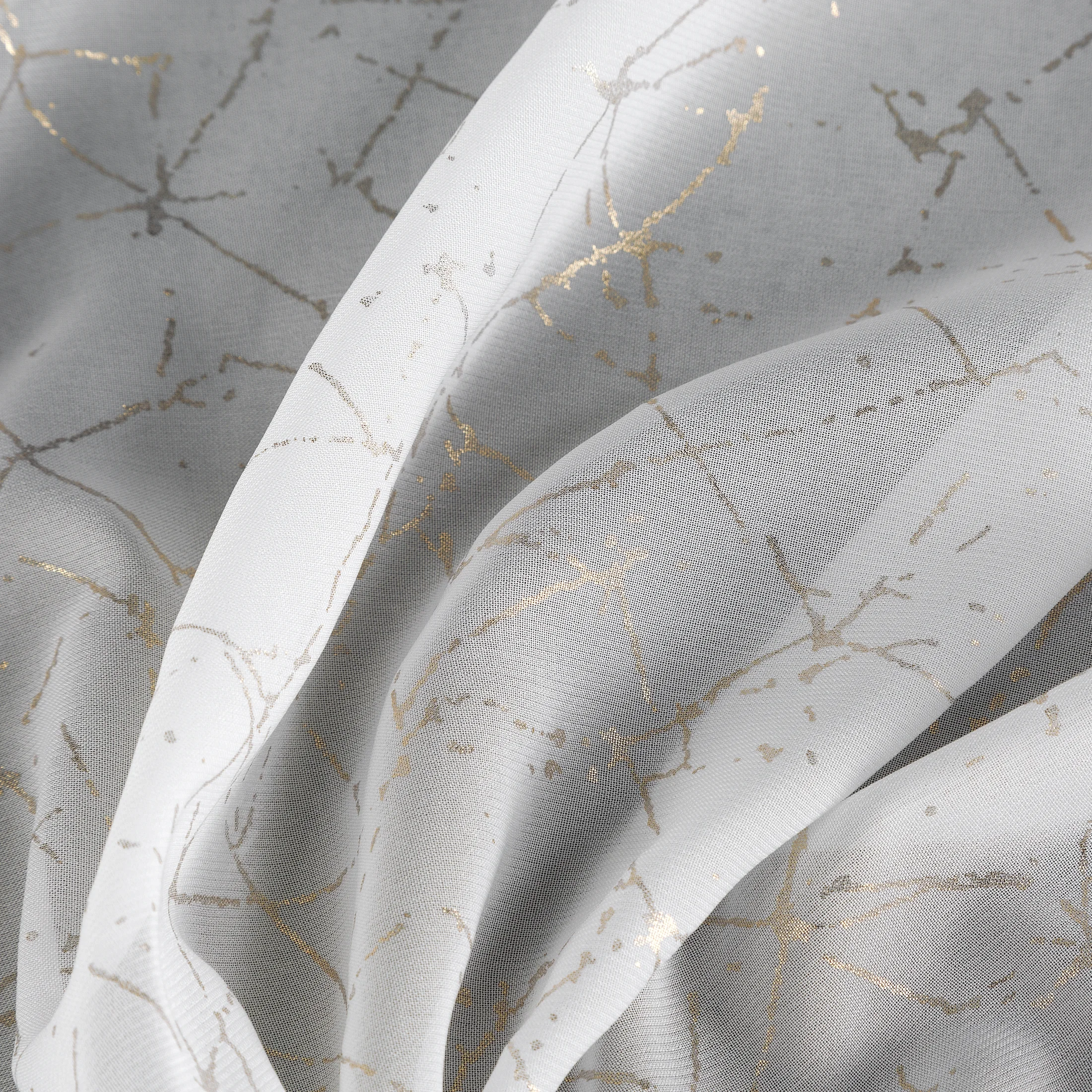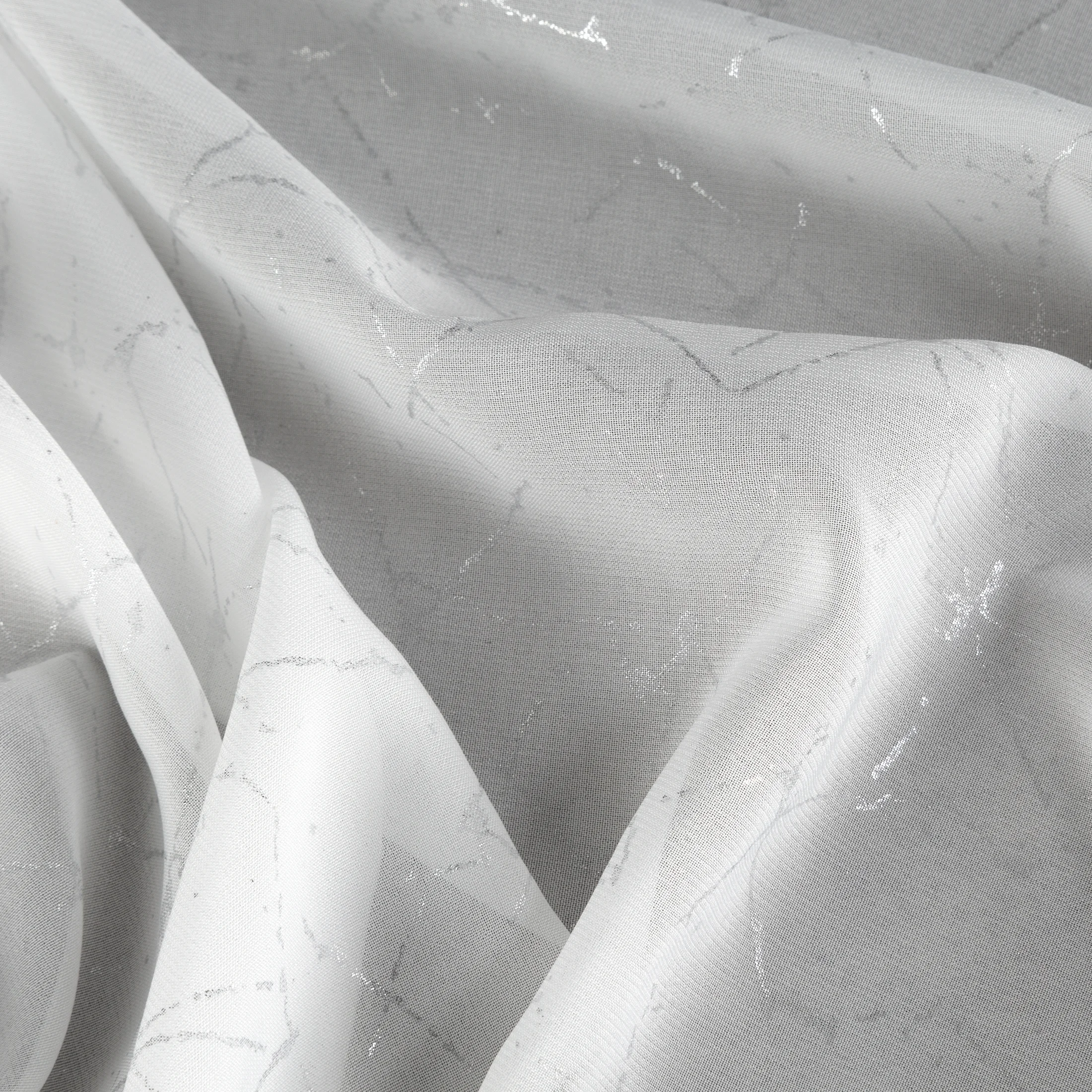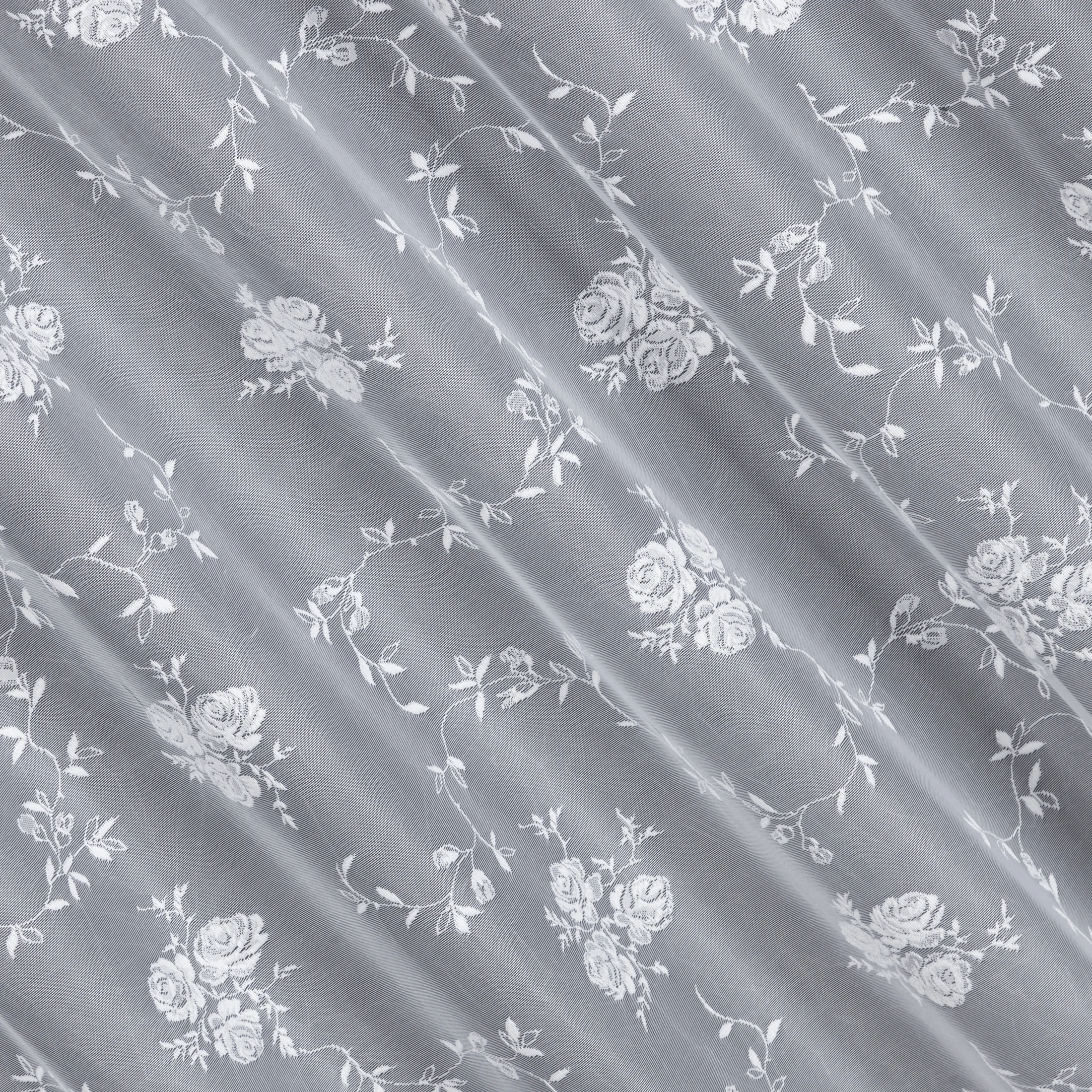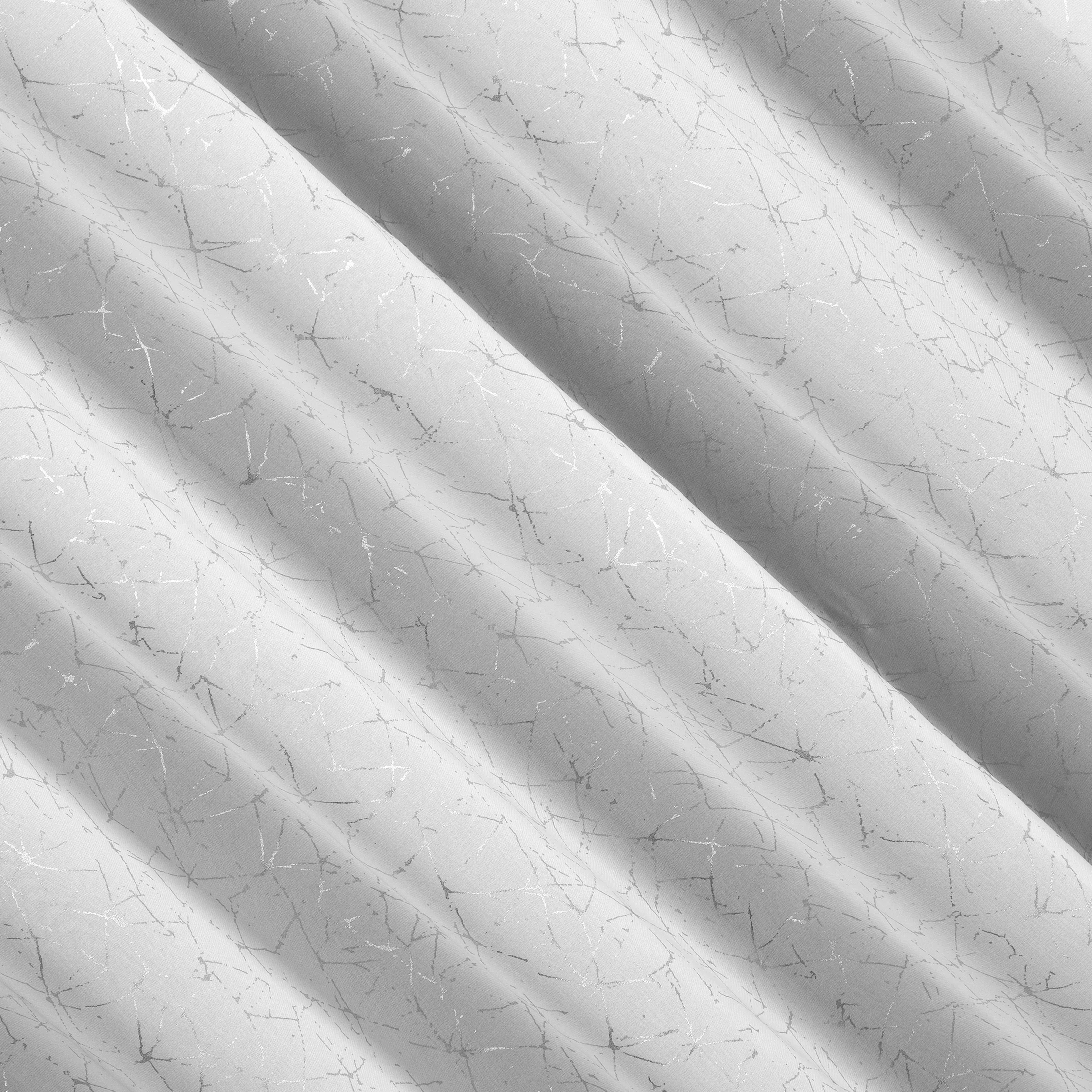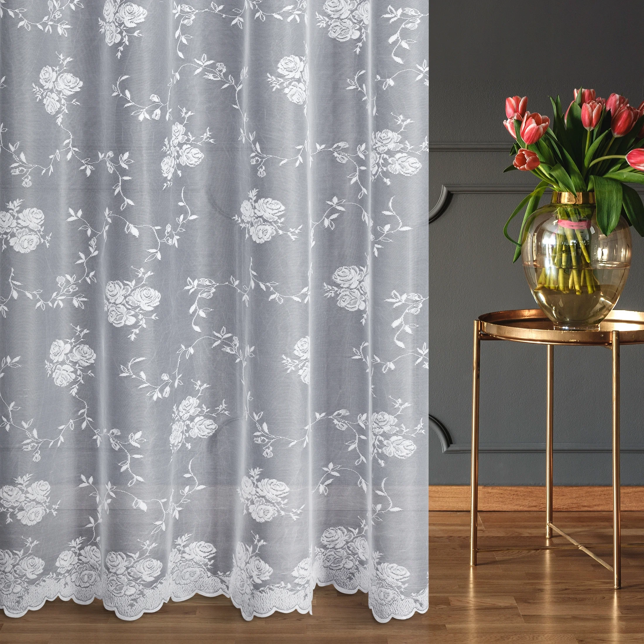 Żakardowa tkanina o gęstym splocie zdobiona nieregularnym wzorem z efektem przecierki to dekoracja pasująca do wnętrza w stylu klasycznym, nowoczesnym, oraz glamour. Półtransparentna tkanina  w kolorze białym, znakomicie odświeża i doświetla wnętrze. Firana ładnie się układa i dobrze prezentuje, zarówno w towarzystwie dobranych, gładkich zasłon, jak i samodzielnie.  Wzór przecierki przyciąga wzrok i dodaje dekoracji nastrojowego wdzięku. Taki elegancki dodatek wpływa na wizualne ocieplenie wnętrza i zapewnia naszym oknom znakomitą prezencję. Tkanina osłania okno, nie powodują zaciemnienia wnętrza, dzięki czemu pomieszczenie jest oświetlone naturalnym światłem. Polecamy  do wnętrz mocno nasłonecznionych, które chcemy osłonić przed nadmiarem promieni słonecznych. Dzięki właściwościom i strukturze firana nie wymaga mozolnego pracowania.