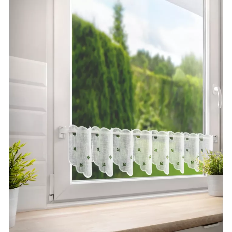 Matowa zazdrostka z etaminy to delikatna firanka, która jest wykonana z lekkiego, półprzezroczystego materiału. Etamina charakteryzuje się delikatnym splotem, który nadaje zazdrostce subtelny wygląd i pozwala na częściowe przepuszczanie światła, co dodaje wnętrzu przytulności i elegancji. Tkanina zdobiona jest haftem gąsek. Haft jest wykonany z precyzją i dbałością o detale, co sprawia, że zazdrostka jest nie tylko praktycznym, ale również estetycznym dodatkiem do wnętrza. Wygodne oczka w górnej krawędzi firany, sprawiają, że z łatwością naciągniesz firankę, na drążek do zazdrostek. Minimalistyczna firanka sprawdzi się zarówno w nowoczesnej, jak i w typowo rustykalnej, czy prowansalskiej kuchni. Aby dobrze dopasować dekorację do okna, szerokość zazdrostki powinna dwukrotnie przekraczać szerokość okna. Warto wziąć pod uwagę, że klasyczne wzory doskonale prezentują się mocno pofałdowane, natomiast nowoczesne modele o mniej skomplikowanych deseniach,  często traciłyby na uroku gdyby były zbyt obficie umarszczone. Firanka jest łatwa w konserwacji i prasowaniu.