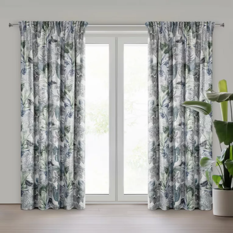 Delikatna w dotyku zasłona z miękkiego welwetu zachwyca modnym wzorem liści egzotycznych roślin. Ta piękna dekoracja okienna z mięsistej tkaniny doskonale wkomponuje się w aranżacje w modnym stylu botanic. Duże, dynamiczny wzór różnych liści fantastycznie podkreśli niebanalne wnętrze. Całość urozmaica dyskretny, błyszczący akcent, który sprawia, że zasłona staje się tajemnicza i przykuwa spojrzenia. Zastosowana taśma marszcząca pozwala na szybkie i wygodne upięcie zasłony na karniszu na kilka sposobów.