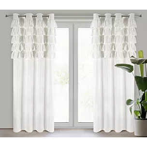 Górna część zasłony ozdobiona jest pięcioma delikatnymi falbanami, które dodają jej lekkości i elegancji. Falbany są starannie uszyte, co podkreśla wysoką jakość wykonania.  Finezyjne falbany wykończone są starannym i estetycznym szwem  typu overlock, dzięki czemu każda falbana pięknie się układa prezentuje z niezwykłą lekkością.