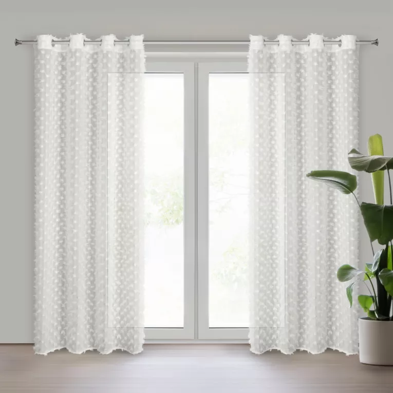 Zasłona gotowa AURELLA z kolekcji Eva Minge, wykonana z lekkiej i zwiewnej tkaniny szyfonowej, to wyjątkowy element dekoracyjny, który łączy nowoczesny styl z elegancją. Zdobiona wzorem pomponów, dodaje wnętrzu nowoczesnego charakteru. Delikatna błyszcząca nić, wpleciona w pompony, nadaje zasłonie lekki połysk, który pięknie odbija światło, podkreślając wyrafinowany charakter projektu. Zasłona jest wyposażona w przelotki, co ułatwia montaż i przesuwanie materiału po karniszu.