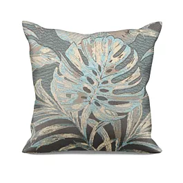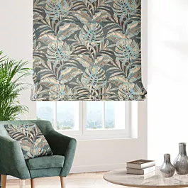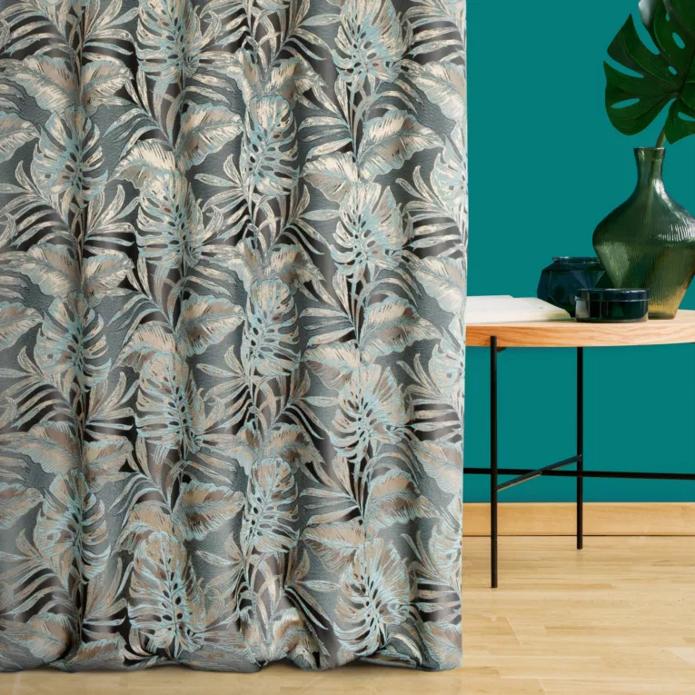 Zasłona szyta na przelotkach popielato miętowa z eleganckiej tkaniny w ciekawy, botaniczny wzór