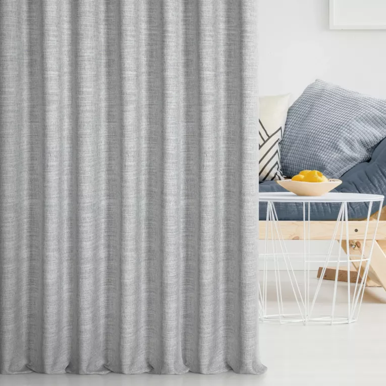 Zasłona szyta na taśmie 5 cm srebrno popielata z tkaniny w stylu eko o naturalnym splocie, z efektem melanżu, wykończona obciążnikiem