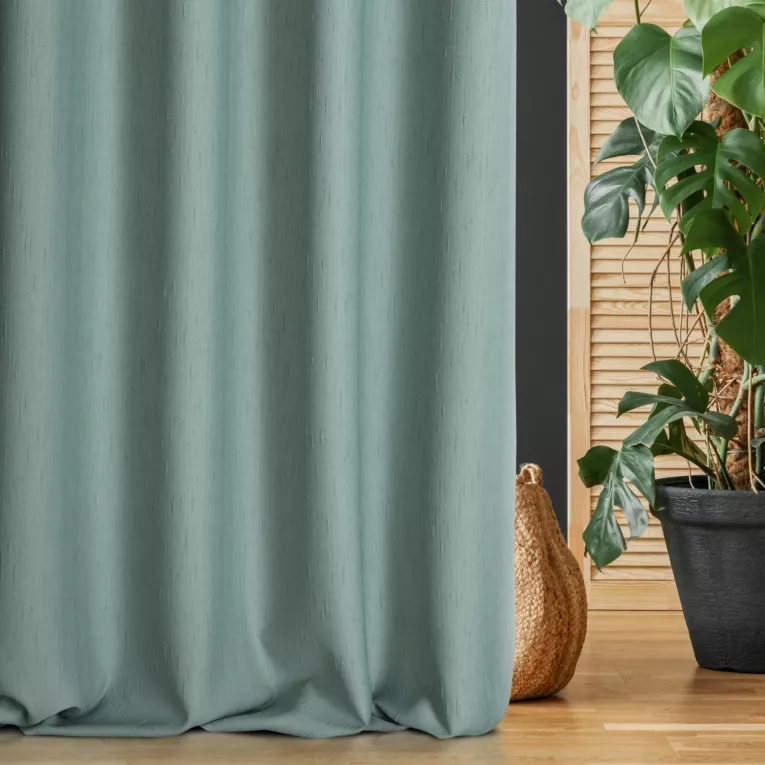 Zasłona szyta na taśmie fala miętowa z miękkiej, matowej tkaniny w stylu eko o naturalnym splocie