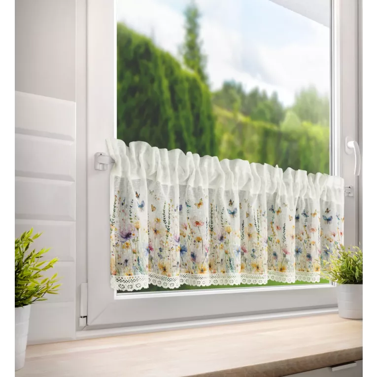 Zazdrostka biało, żółta z etaminy zdobiona nadrukiem kwiatów i koronką 150x30 cm tunel ROZALIE Eurofirany