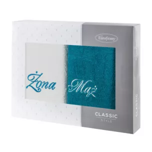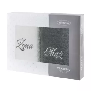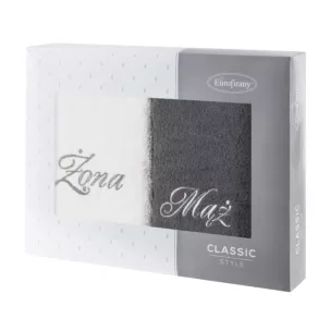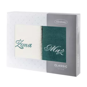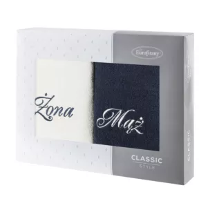 Szukasz praktycznego i eleganckiego prezentu? Komplet miękkich ręczników z haftowanym napisem zapakowany został w elegancki karton z okienkiem. Takie pudełko z ręcznikami to pomysł na udany prezent z okazji ślubu lub rocznicy. W skład zestawu wchodzą dwa ręczniki w dopasowanych kolorach. Zdobiący krótszy brzeg ręcznika dekoracyjny haft z napisem Żona i Mąż nadają ręcznikom indywidualnego stylu. Miękka tkanina bawełniana typu frotte sprawia, że ręczniki są przyjemne w dotyku i chłonne. Ręczniki zapakowane są w dekoracyjne pudełko z przejrzystym okienkiem.